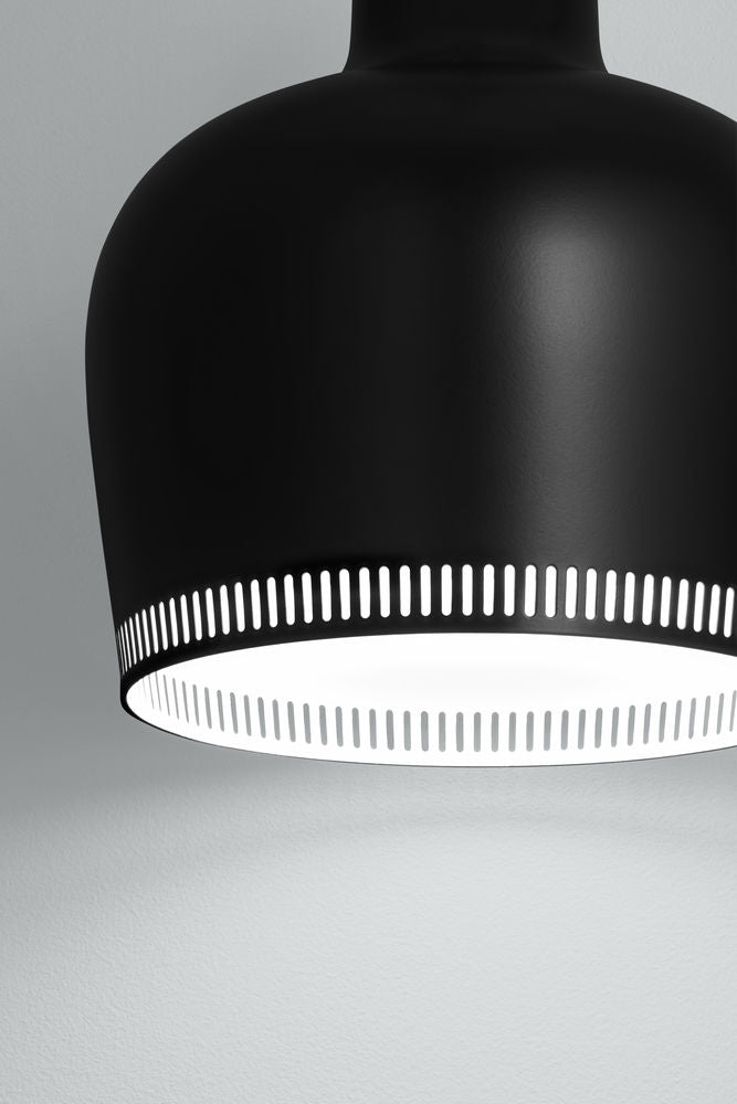 「ゴールデンベル」という愛称で親しまれるアルヴァ・アアルトのデザインによるアイコン的ペンダントランプ。その姿は灯りがともっていてもいなくても、まるで彫刻のように美しい佇まいをしています。接合を施さない一つの真鍮により形作られるは、下に向かった開口部から光が放たれることにより眩しさを抑え、シェードに刻まれた穴から光が輪のように分散されるよう機能的にデザインされています。1936年、ヘルシンキにあるサヴォイレストランの内装のために考案され、翌年、パリ万博のフィンランドパビリオンで発表された機能的な構造から放たれる温かく柔らかな光とフォルムの美しさは、まさにアルヴァ・アアルトの哲学を体現した姿といえます。 - Materials