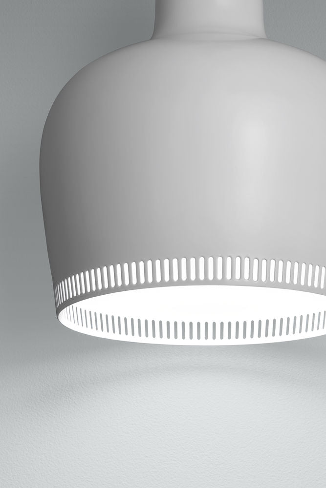 「ゴールデンベル」という愛称で親しまれるアルヴァ・アアルトのデザインによるアイコン的ペンダントランプ。その姿は灯りがともっていてもいなくても、まるで彫刻のように美しい佇まいをしています。接合を施さない一つの真鍮により形作られるは、下に向かった開口部から光が放たれることにより眩しさを抑え、シェードに刻まれた穴から光が輪のように分散されるよう機能的にデザインされています。1936年、ヘルシンキにあるサヴォイレストランの内装のために考案され、翌年、パリ万博のフィンランドパビリオンで発表された機能的な構造から放たれる温かく柔らかな光とフォルムの美しさは、まさにアルヴァ・アアルトの哲学を体現した姿といえます。 - Materials