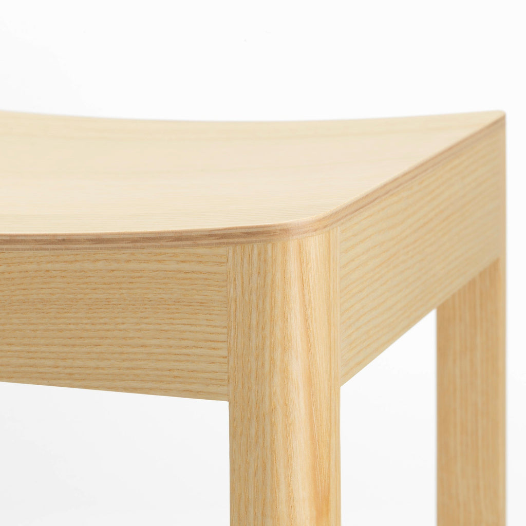無垢材を用いたシンプルなデザインの「アトリエ バースツール」は、職人の精巧な技術と研究により生み出されました。重さは約4キログロムと軽量で、全体のフォルムも足置きもコンパクトなため、持ち運びが簡単です。アトリエバースツールは、前後左右対称で、向きを選ばず好きな位置に座ることができる汎用性の高いデザインです。さらに、三次元的な座面の柔らかなラインと、前脚と後脚を繋ぐ添え木の直線的で幾何学的なラインの組み合わせで構成されています。アルテックのサスティナブルなものづくりへの想いを継承し、調達と輸送に効率の良いイタリア産の木材から製造され、2つのシートハイのバリエーションがあります。