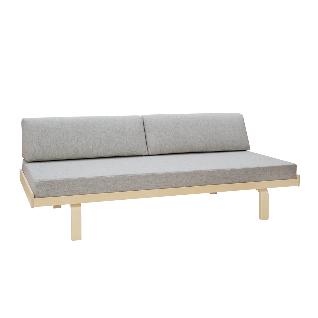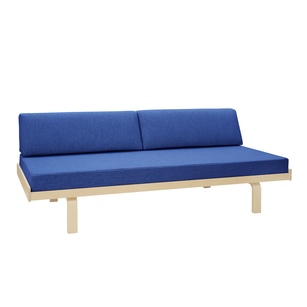 「デイベッド 710」は、アルヴァ・アアルトが開発した曲げ木の技術「L - レッグ」を応用したシリーズのひとつです。スツールやチェアに使われているL - レッグの脚の上に、木製のフレームを設置するシンプルかつ頑丈な構造で、必要に応じて脚部を取り外すことができます。バーチ材によるデイベッド 710は、マットレスを置いてベッドとしても、背もたれになるバッククッションと組み合わせてソファとしても使うことができます。